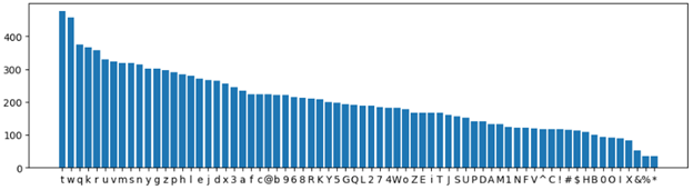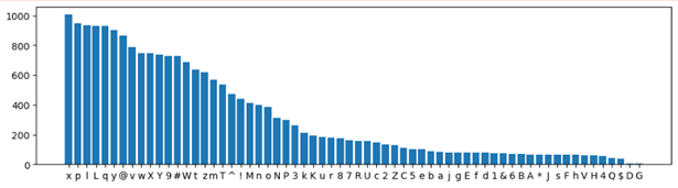 Ispod je prikazan histogram svih simbola u 1.000 generisanih lozinki pomoću ChatGPT – jasno je da gotovo sve lozinke sadrže simbole x, p, l, L ….